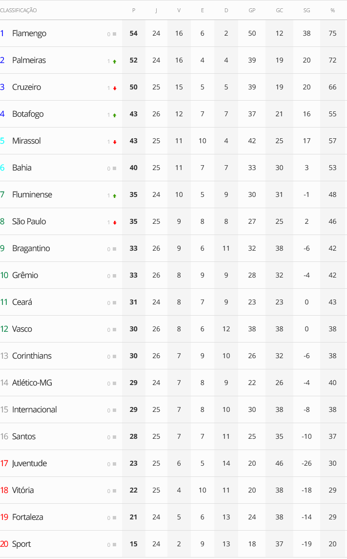 Atlético-MG 0 x 0 Juventude abriu, na terça-feira, a 26ª rodada do Campeonato Brasileiro. Nesta quarta-feira, outros seis jogos foram disputados. O Vasco, que perdeu para o Palmeiras em São Paulo, está na 12ª colocação.