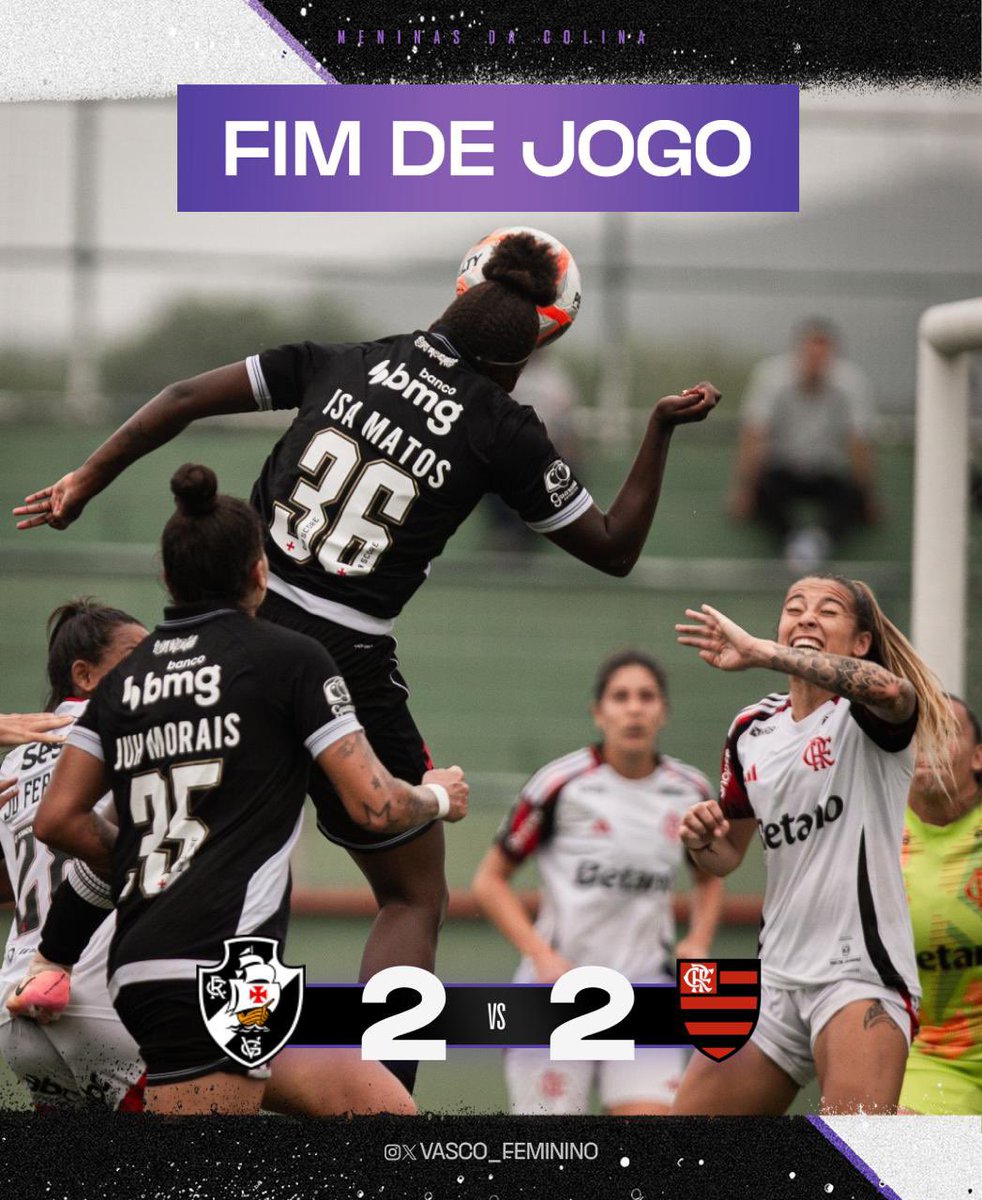 O Vasco empatou com o Flamengo por 2 a 2 na manhã deste domingo no Nivaldo Pereira pelo jogo de ida da semifinal do Campeonato Estadual Feminino. Carolzinha e Isa Matos marcaram para o Gigante da Colina.