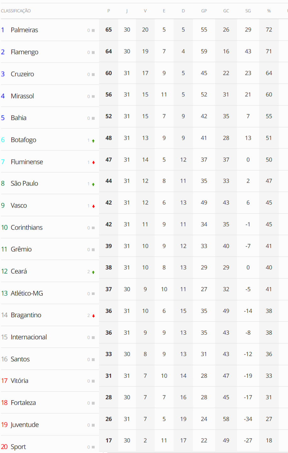 Terminada a 31ª rodada do Campeonato Brasileiro, o Vasco, que perdeu para o São Paulo por 2 a 0, caiu da 8ª para a 9ª colocação.