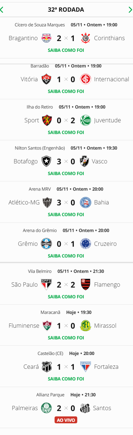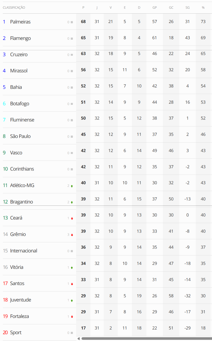 Terminada a 32ª rodada do Campeonato Brasileiro, o Vasco, que perdeu para o Botafogo por 3 a 0, segue na 9ª colocação. O Gigante da Colina está a 8 pontos da zona de classificação para a Libertadores 2026.