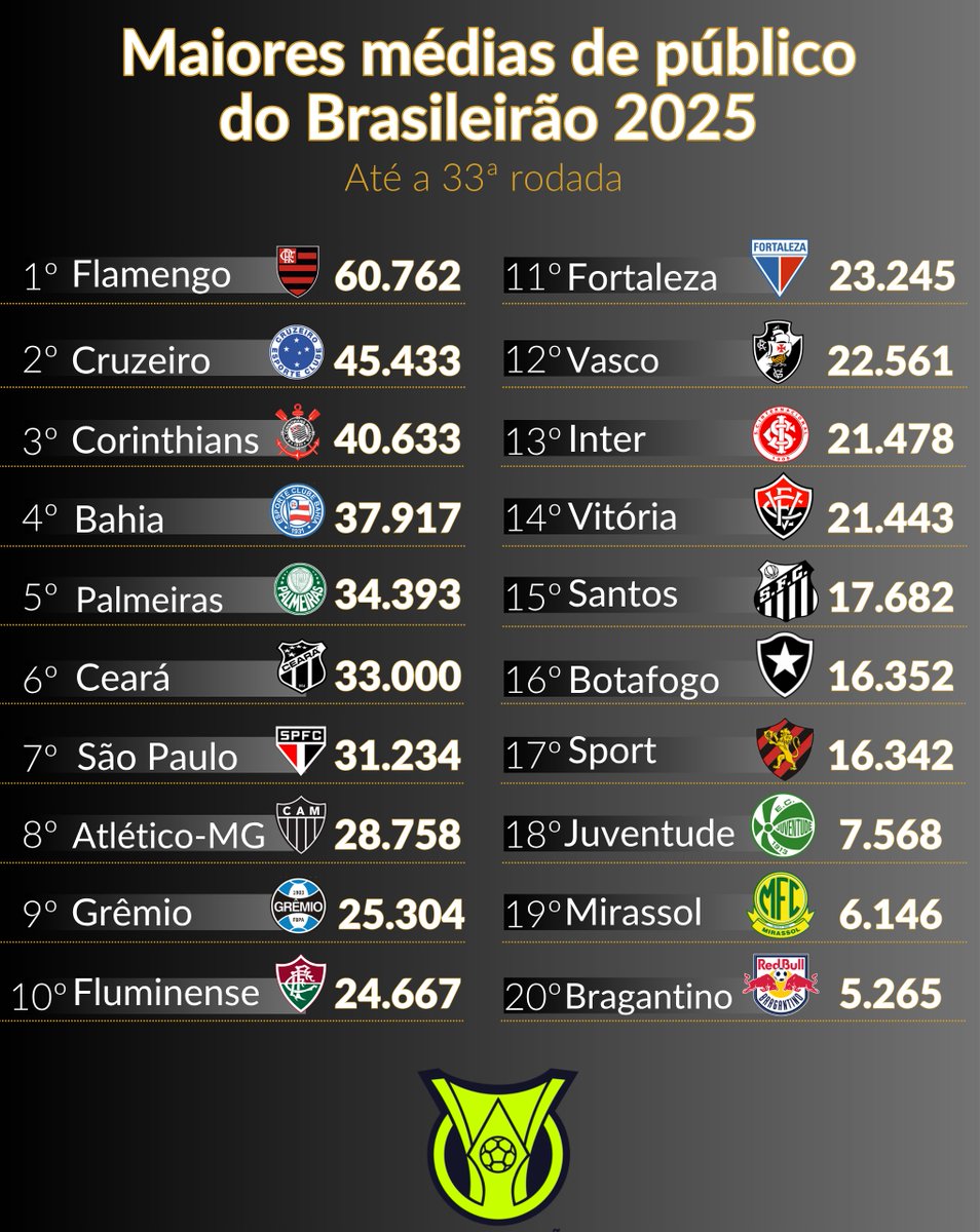 Média de público presente do Brasileirão 2025 até a 33ª rodada: