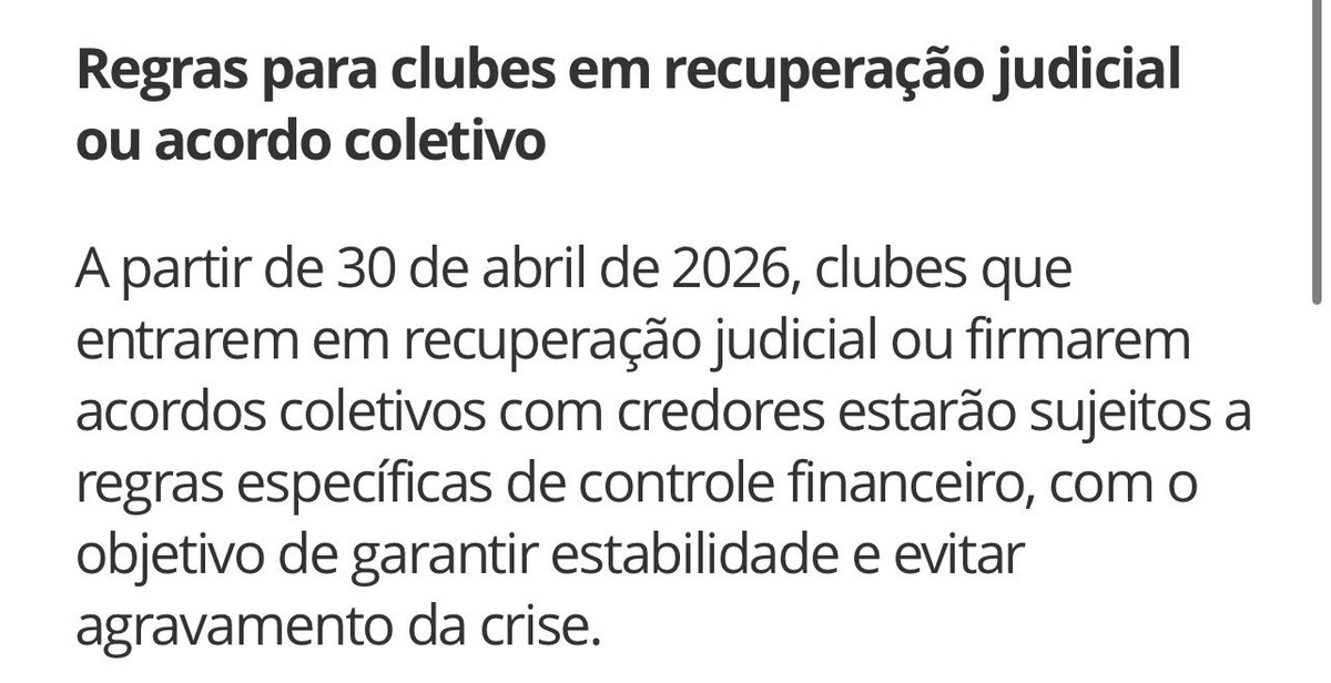 - Controle de dívidas: Os clubes tem que quitar novas dívidas com credores relevantes até janeiro de 2026. As dívidas antigas terão um prazo maior, devendo ser regularizadas até novembro de 2026.