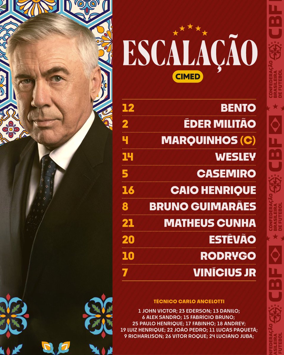Confira a escalação do Brasil para o amistoso contra a Tunísia; Paulo Henrique e Andrey Santos começam no banco