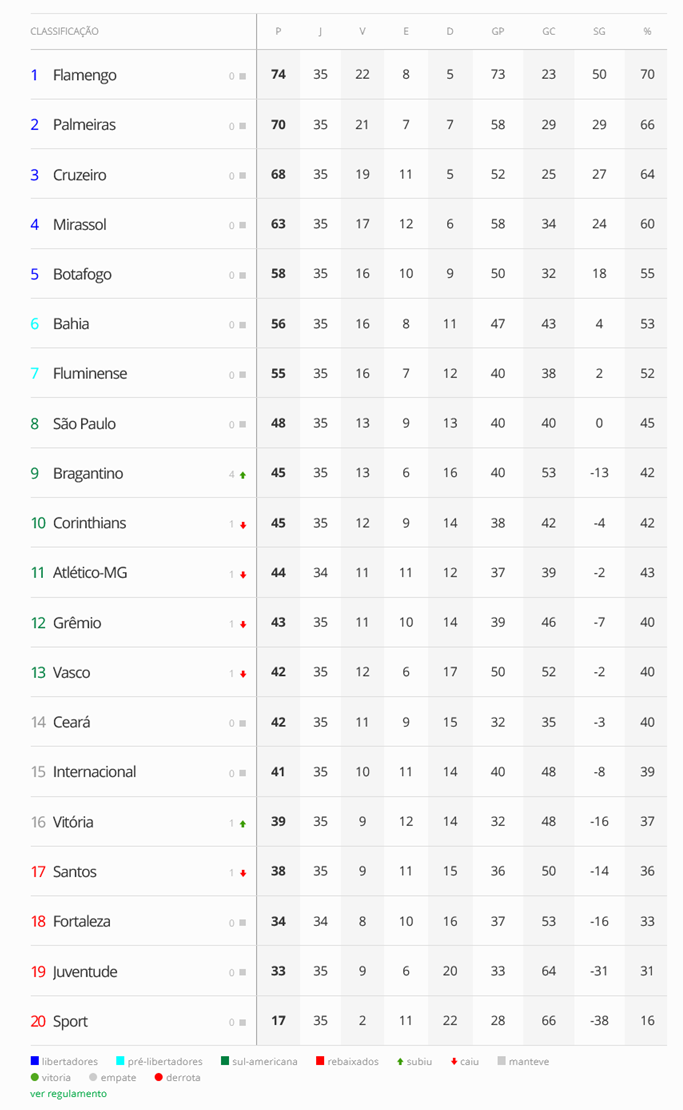 Dois jogos movimentaram a 35ª rodada do Campeonato Brasileiro nesta 2ª-feira. O Vasco segue na 13ª posição, mas viu sua distância para o Z4 diminuir para 4 pontos.