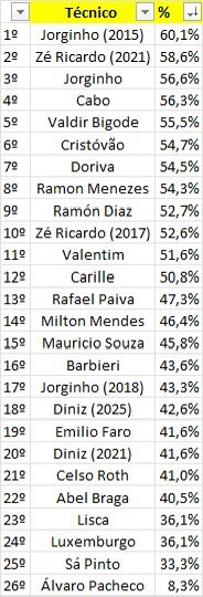 Fiz um ranking com os percentuais de aproveitamento de cada um deles (desconsiderando interinos).