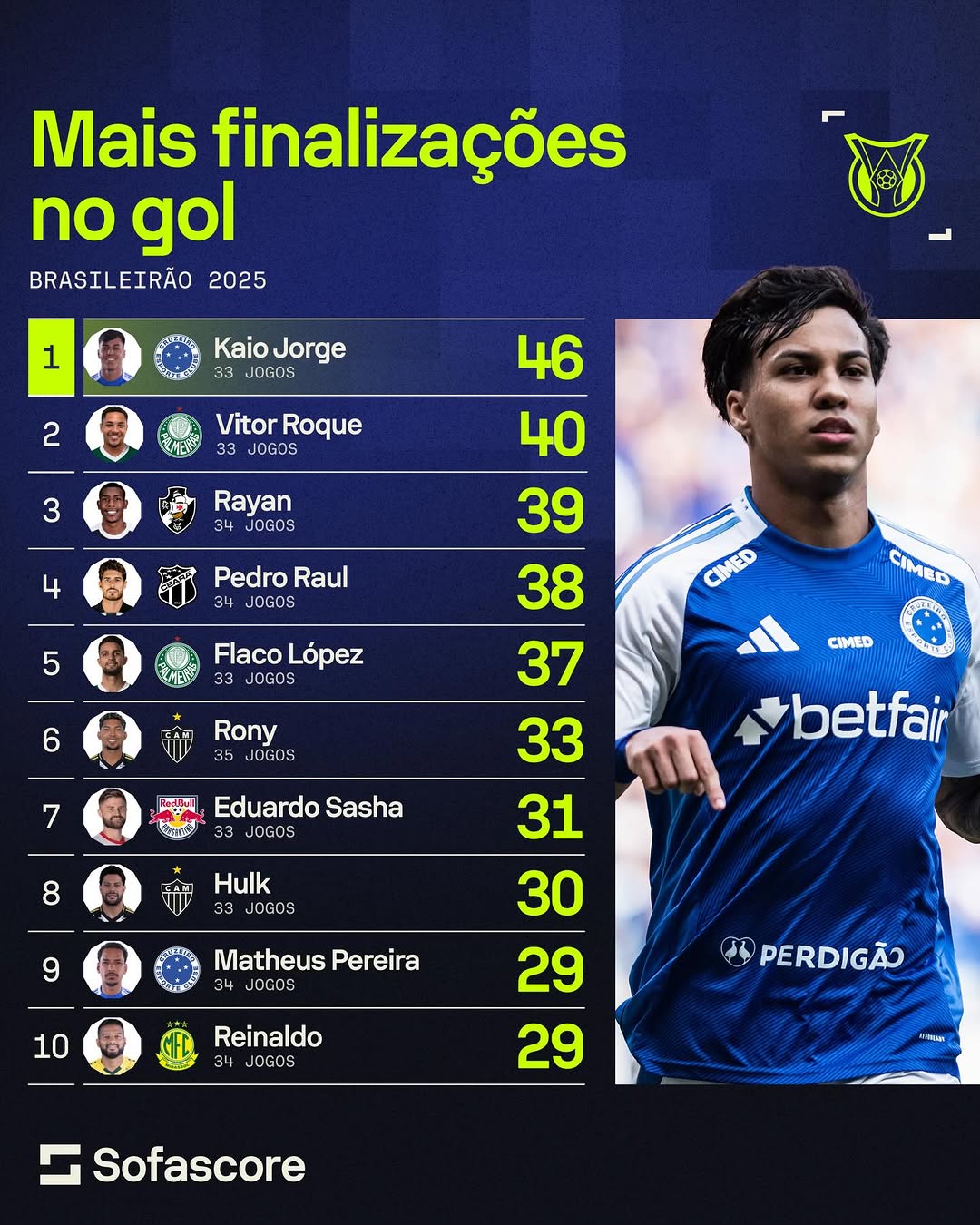Rayan foi o 3º jogador que mais finalizou em gol no Brasileiro 2025