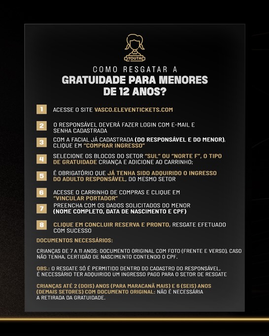 Crianças até 2 (dois) anos (P/ Maracanã Mais) e 6 (seis) anos (Demais setores): Documento original. Não é necessário o resgate da gratuidade.
