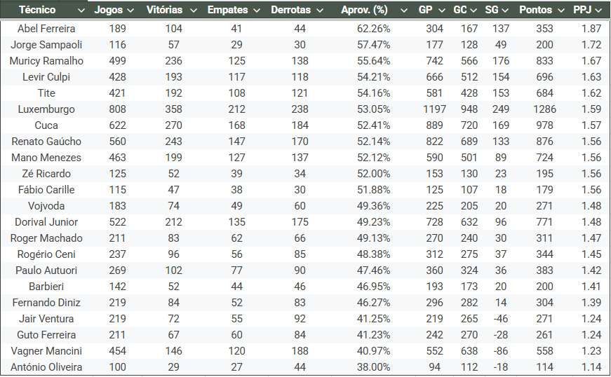 Veja comparação entre os aproveitamentos dos técnicos com mais de 100 jogos pelo Campeonato Brasileiro