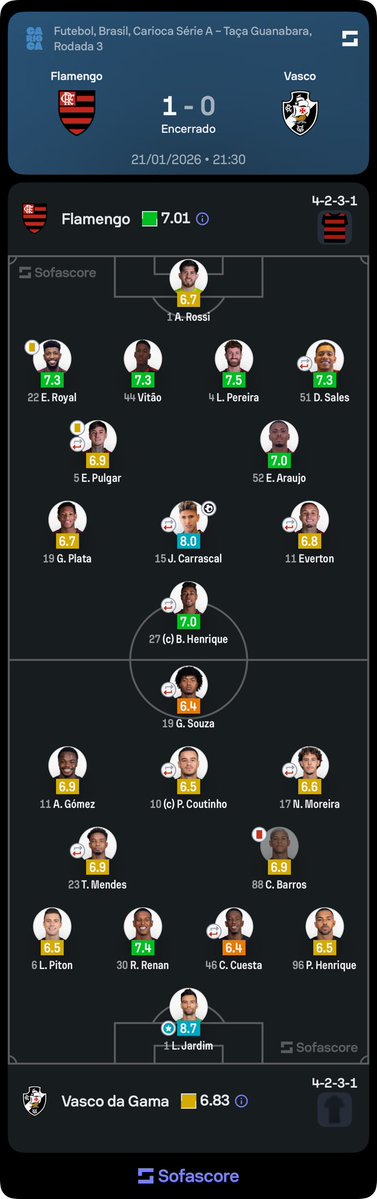 21/01/26 - Confira as estatísticas de Urubu 1 x 0 Vasco