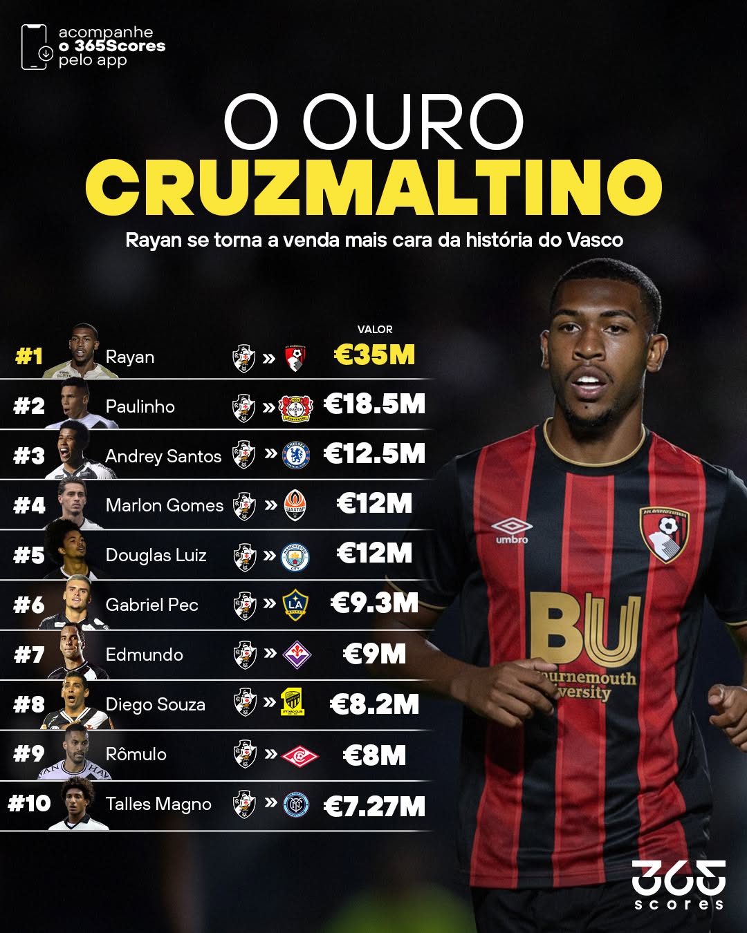 A negociação de Rayan com o Bournemouth explodiu o topo da lista das maiores transferências do Vasco.
