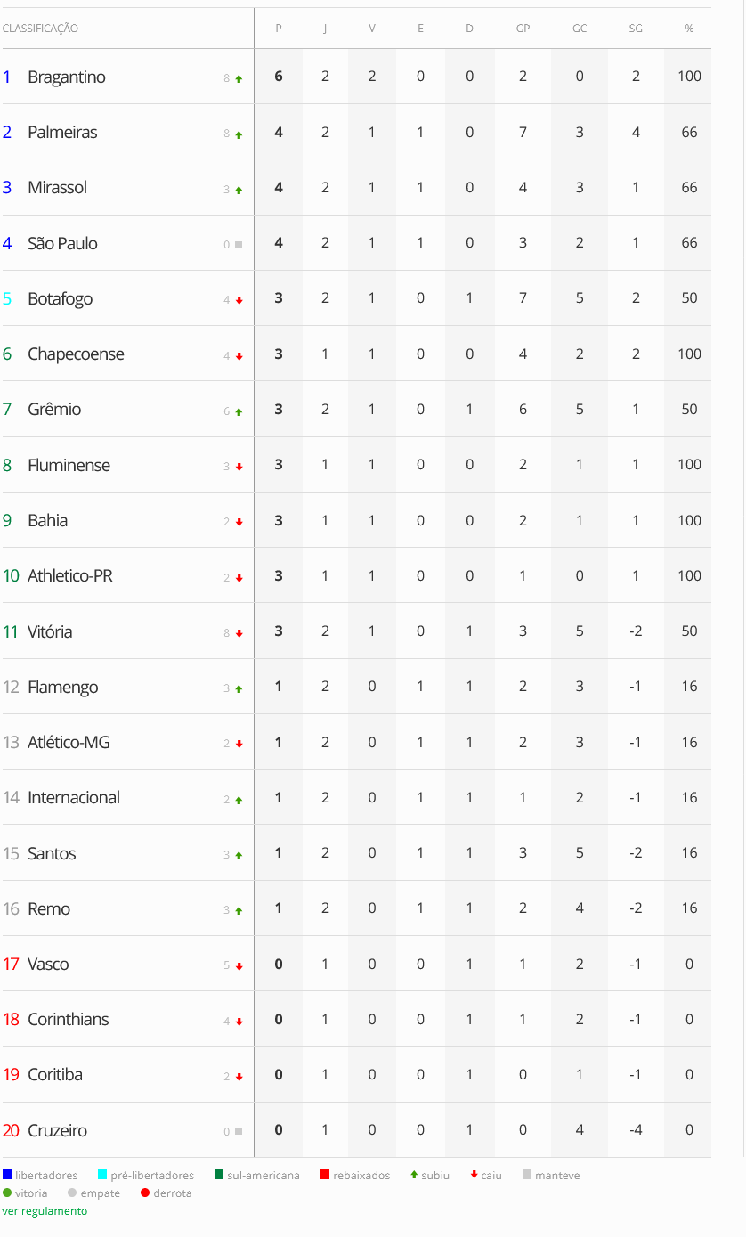 Confira a classificação do Campeonato Brasileiro após os jogos de 4ª-feira da 2ª rodada