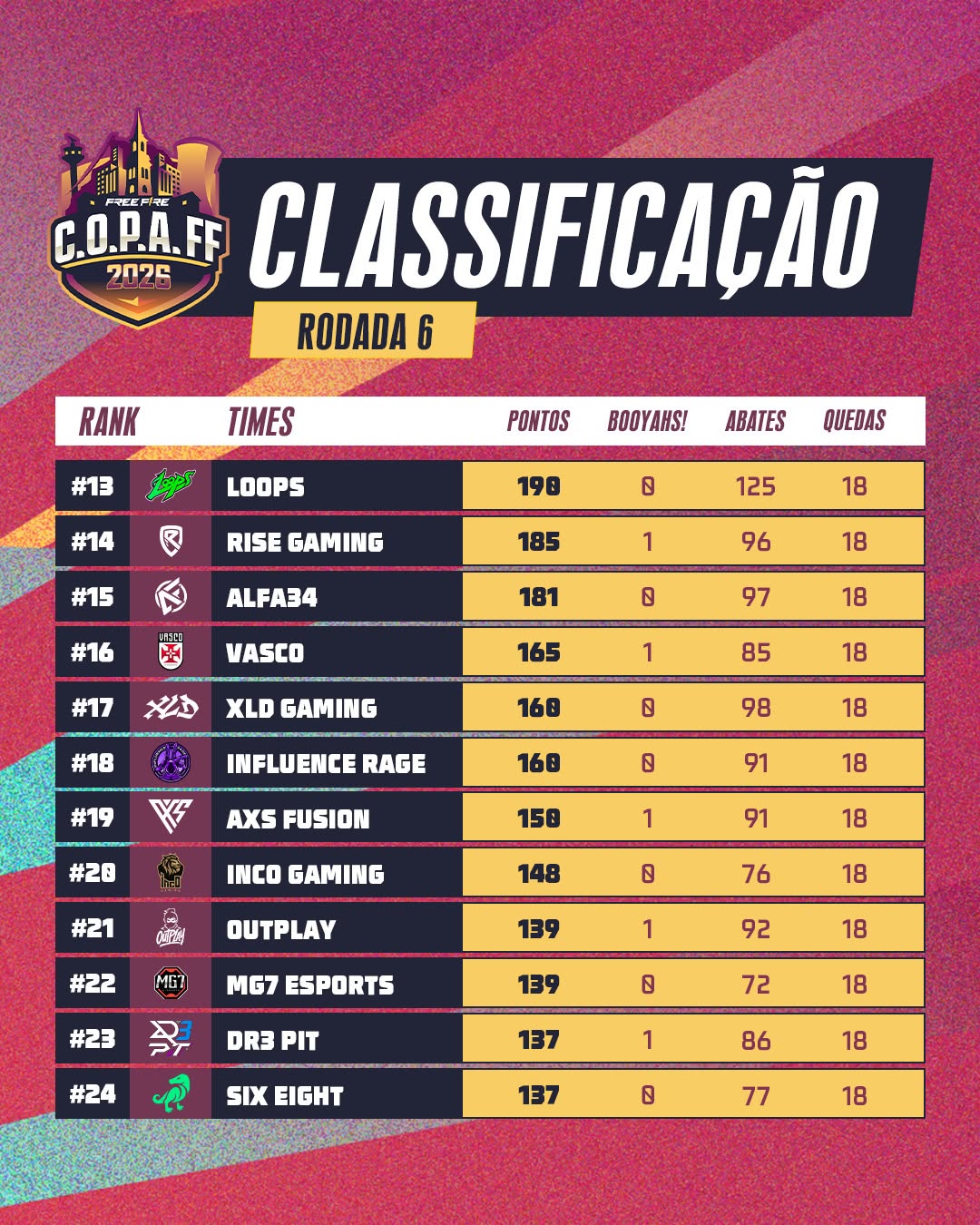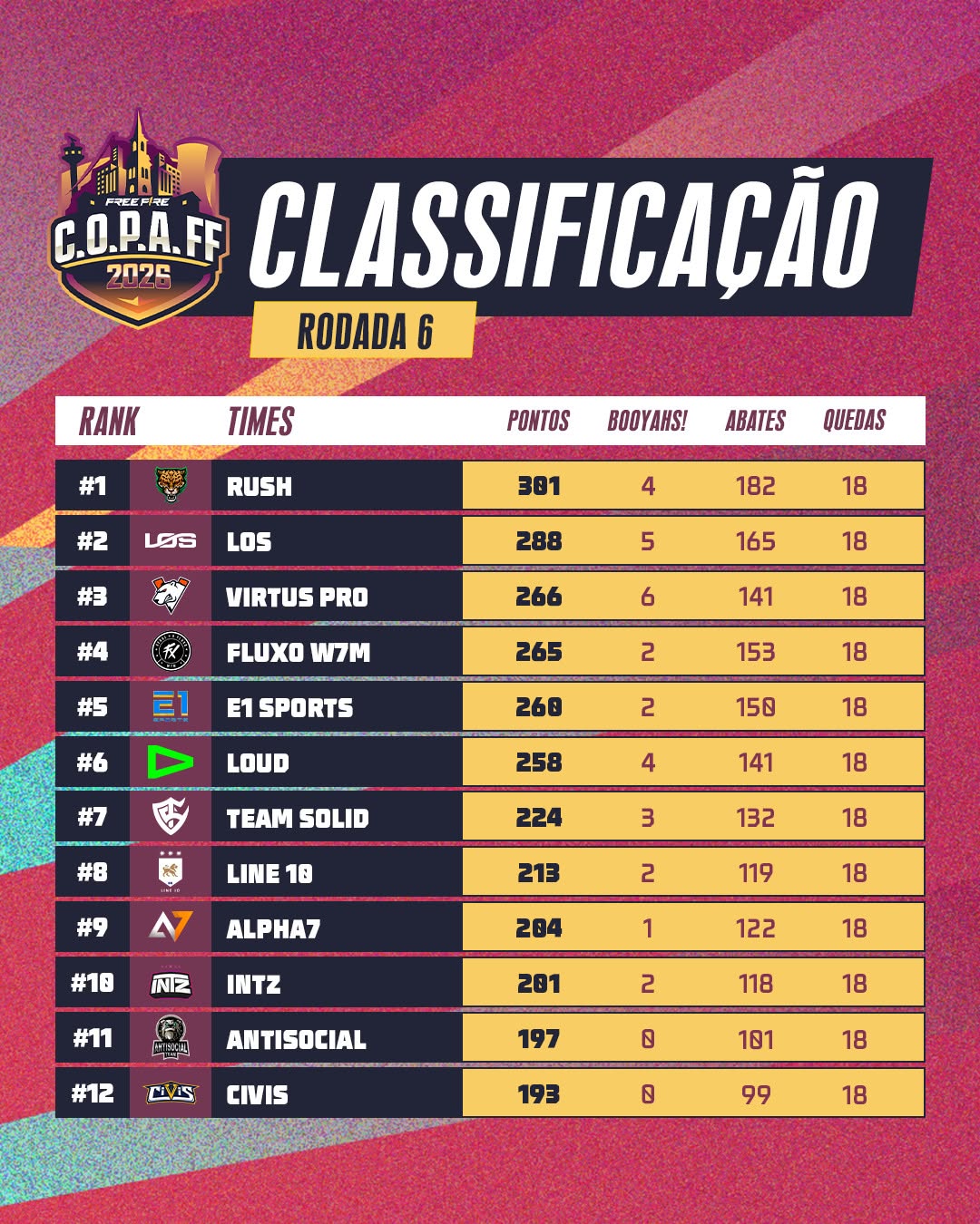 O top 6 da nossa tabela já está classificado para a FINAL DA C.O.P.A FF 26 nos dias 21 e 22/02.
