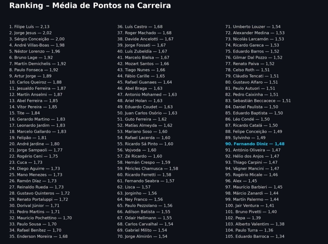 Se na carreira, o Diniz tem 1,48 pontos por partida e ocupa a 90° posição entre 105 técnicos — tabela que fiz com treinadores da Série A, B, portugueses e sul-americanos.