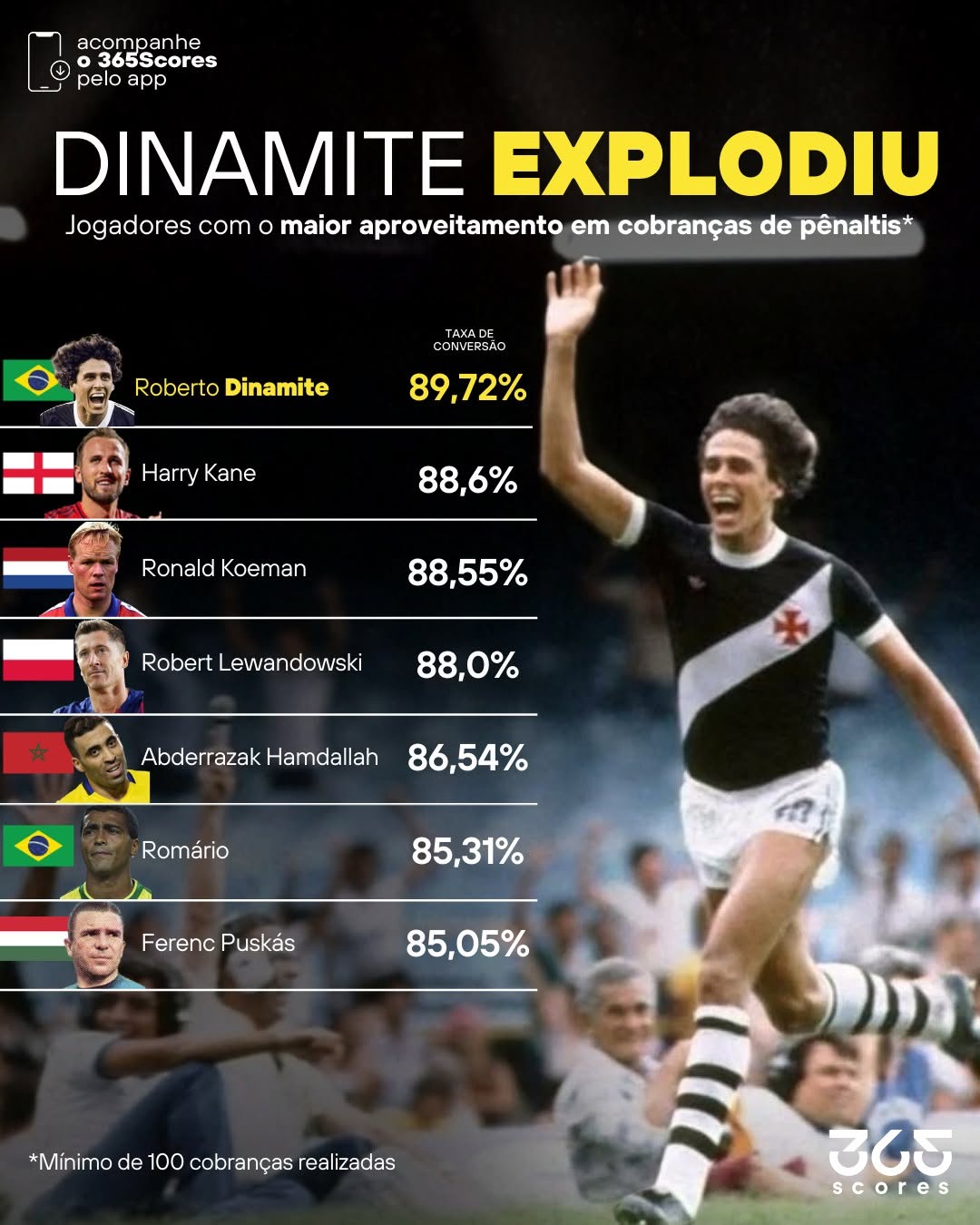 O ídolo do Vasco superou nomes como Harry Kane e Lewandowski, convertendo quase 90% de suas batidas. Romário é o outro brasileiro que aparece no Top 6 dessa lista de batedores implacáveis. 🎯