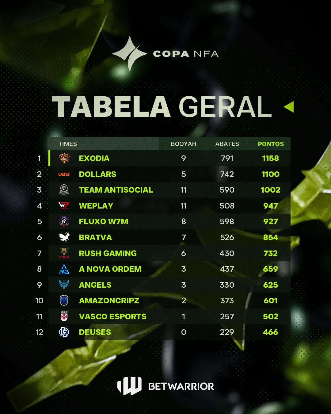A Exodia segue firme no topo com 1158 pontos e impressionantes 791 abates, mostrando um estilo agressivo e domínio total de mapa