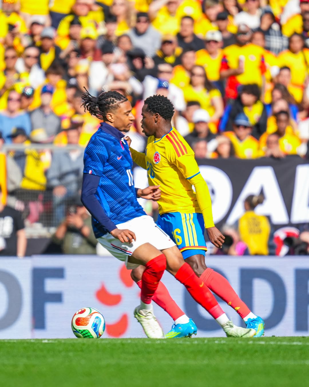 01:58 - Veja foto de Andrés Gómez marcando Mbappé no amistoso entre Colômbia e França