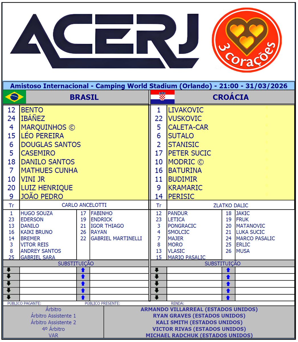 Escalações de Brasil e Croácia em jogo amistoso de preparação para a Copa do Mundo de 2026 no Camping World Stadium em Orlando #Acerjinforma #BRAxCRO #BRACRO @CBF_Futebol @HNS_CFF