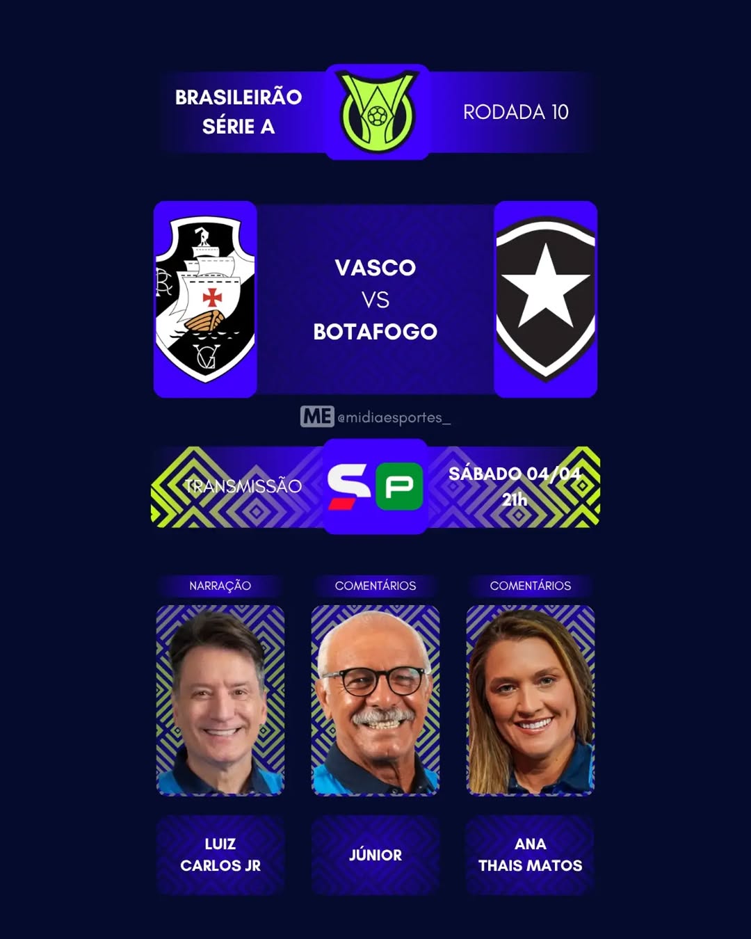 Confira os profissionais que trabalharão na transmissão de Vasco x Botafogo