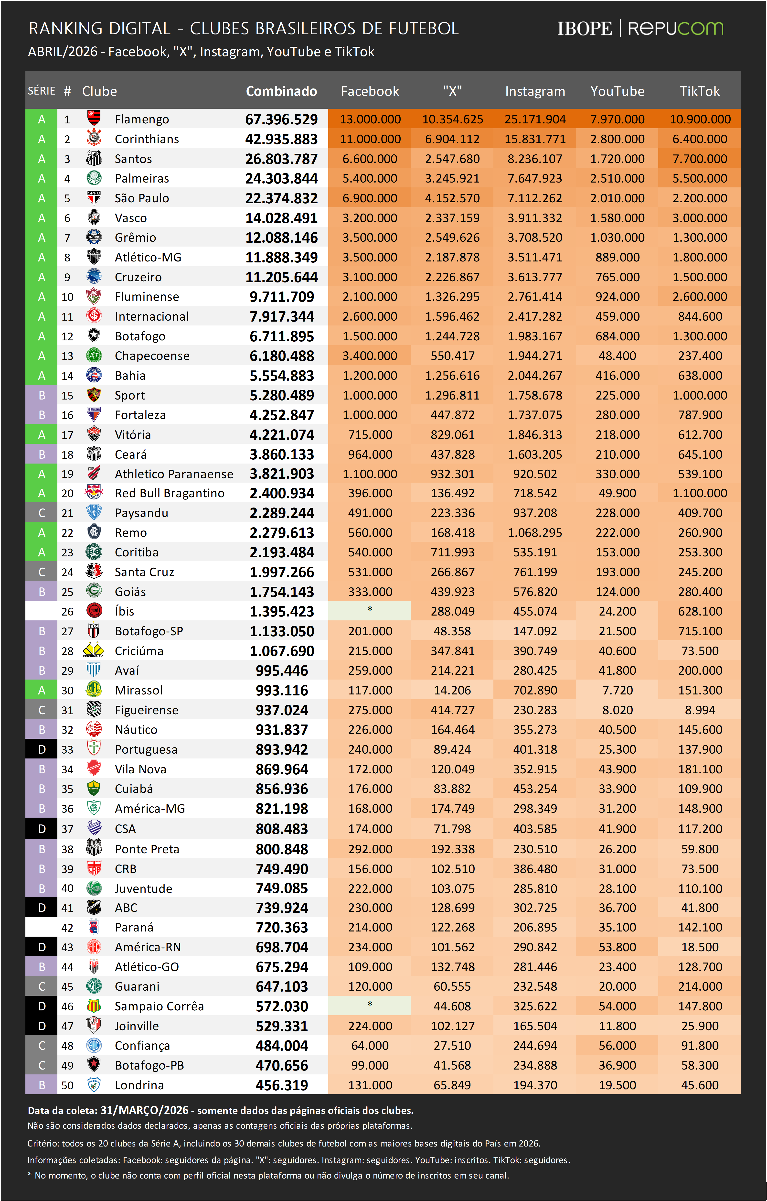 Na edição atual do Ranking Digital dos Clubes Brasileiros do IBOPE Repucom, destacam-se os resultados de Flamengo, Cruzeiro, Santos, Palmeiras e Corinthians. Estes cinco foram os que registraram os maiores saldos de inscrições em suas redes sociais em março ao somarem, juntos, mais de 1,1 milhão de novas inscrições.