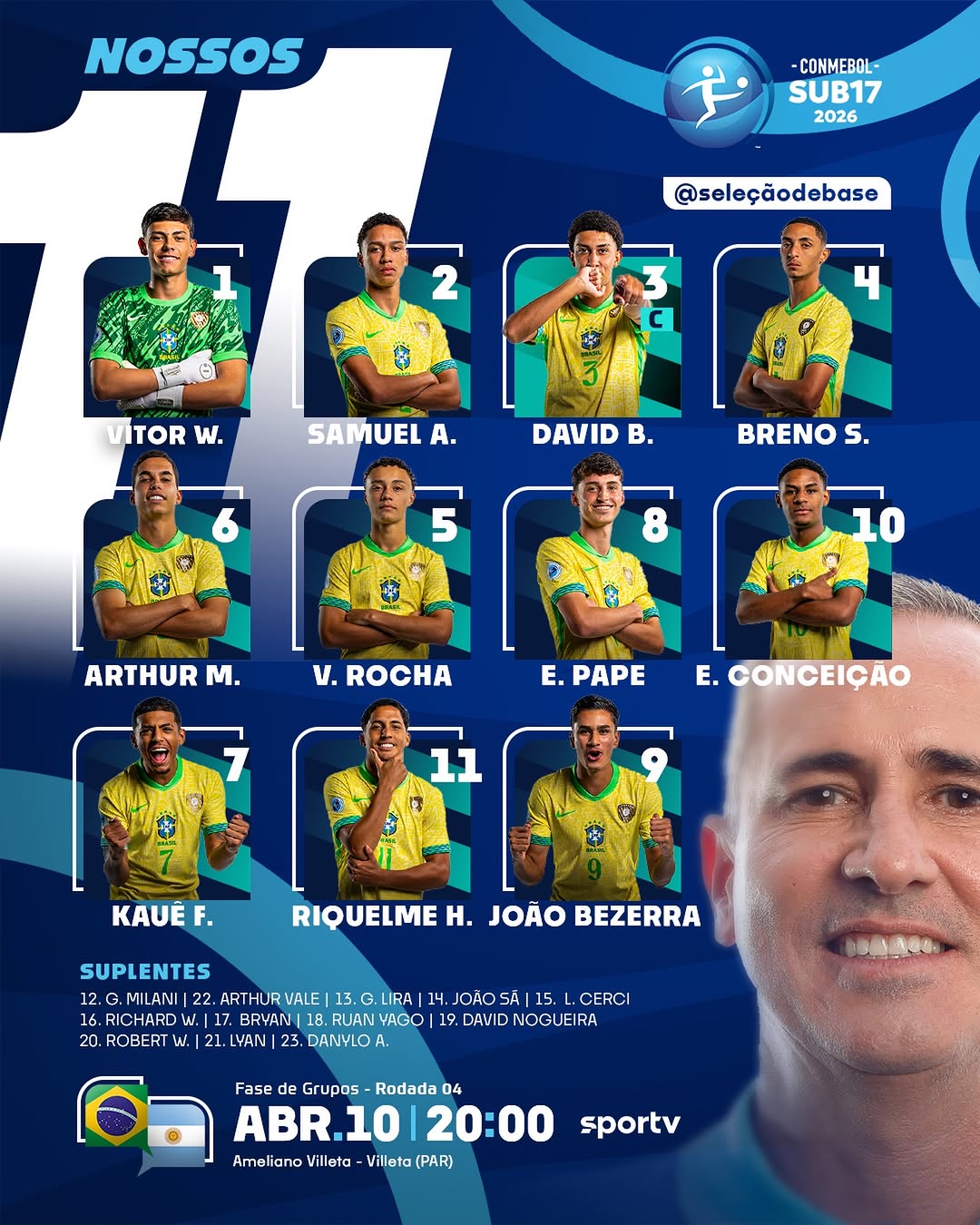 A Seleção Brasileira Sub-17 está escalada para a quarta rodada do Sul-Americano, contra a Argentina