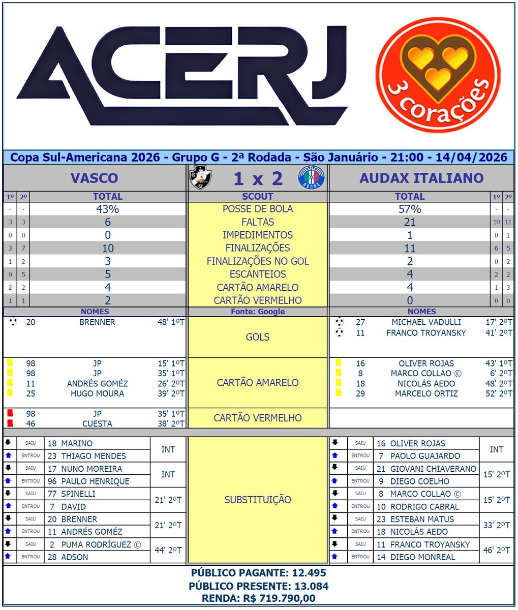 VASCO: Leo Jardim; Puma Rodríguez (Adson, 42'/2ºT), Carlos Cuesta, Lucas Freitas e Lucas Piton; Hugo Moura e JP; Nuno Moreira (Paulo Henrique, Intervalo) , Hinestroza (Thiago Mendes, Intervalo) , Spinelli (David, 19'/2ºT) e Brenner (Andrés Gómez, 19'/2ºT). Técnico: Renato Gaucho.