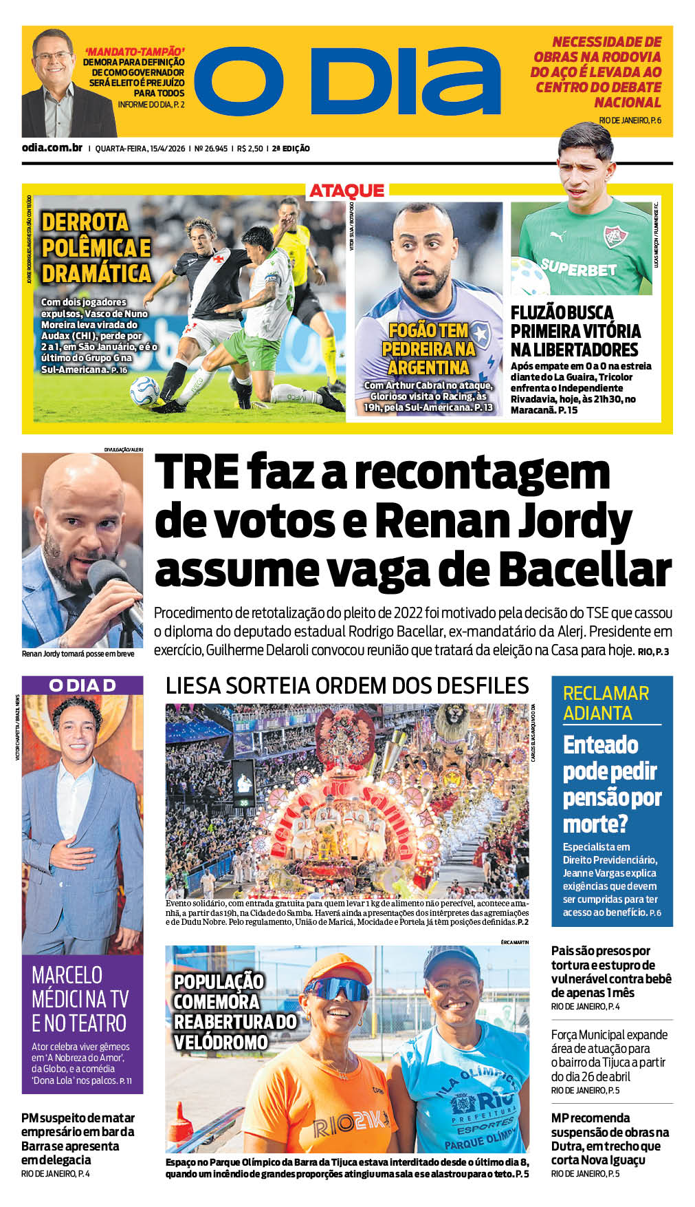Pela Copa Sul-Americana, o Vasco, prejudicado pela arbitragem, foi derrotado pelo Audax Italiano por 2 a 1 de virada em São Januário. No basquete, o Vasco foi rebaixado no NBB. Veja as capas dos jornais.