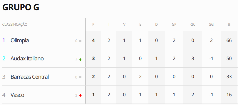 Fechando a segunda rodada do Grupo G da Copa Sul-Americana, Olimpia e Barracas Central empataram por 0 a 0 na noite desta 4ª-feira no Defensores del Chaco, em Assunção, no Paraguai. Com esse resultado, o Vasco, que perdeu em casa para o Audax Italiano por 2 a 1, terminou a rodada na lanterna do grupo.