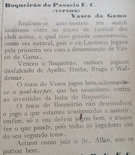 Por muito tempo se pensou que a estreia do Vasco no "foot-ball" havia ocorrido em 1916. Uma notícia publicada no dia 14/12/1915 pelo jornal A Tribuna, no entanto, joga uma nova luz sobre esse acontecimento histórico. Segundo a nota, o Vasco foi ao gramado pela primeira vez no dia 12 de dezembro de 1915, contra o Boqueirão do Passeio, e perdeu a partida, embora o placar não tenha sido divulgado. A curta reportagem confirma que o "match" amistoso marcou a primeira aparição do ex-Lusitania com a denominação Vasco da Gama e que, por isso, atraiu um grande público. O texto ainda destaca que, apesar da derrota, o Vasco teve boa atuação, com menção especial ao goleiro cruz-maltino, que fez "assombros". A coleção do jornal A Tribuna integra o acervo da Biblioteca Nacional.
