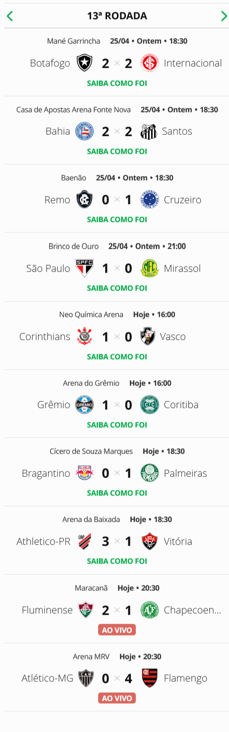 Terminada a 13ª rodada do Campeonato Brasileiro, o Vasco, que perdeu para o Corinthians por 1 a 0, está na 10ª colocação. O Gigante da Colina está a 6 pontos do G5 (zona de classificação à Libertadores) e a 2 pontos do Z4 (zona do rebaixamento).