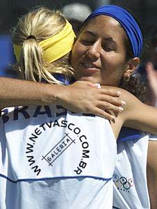 (21/09) Joana Cortez comemora a vitória na estréia contra uma dupla chinesa.