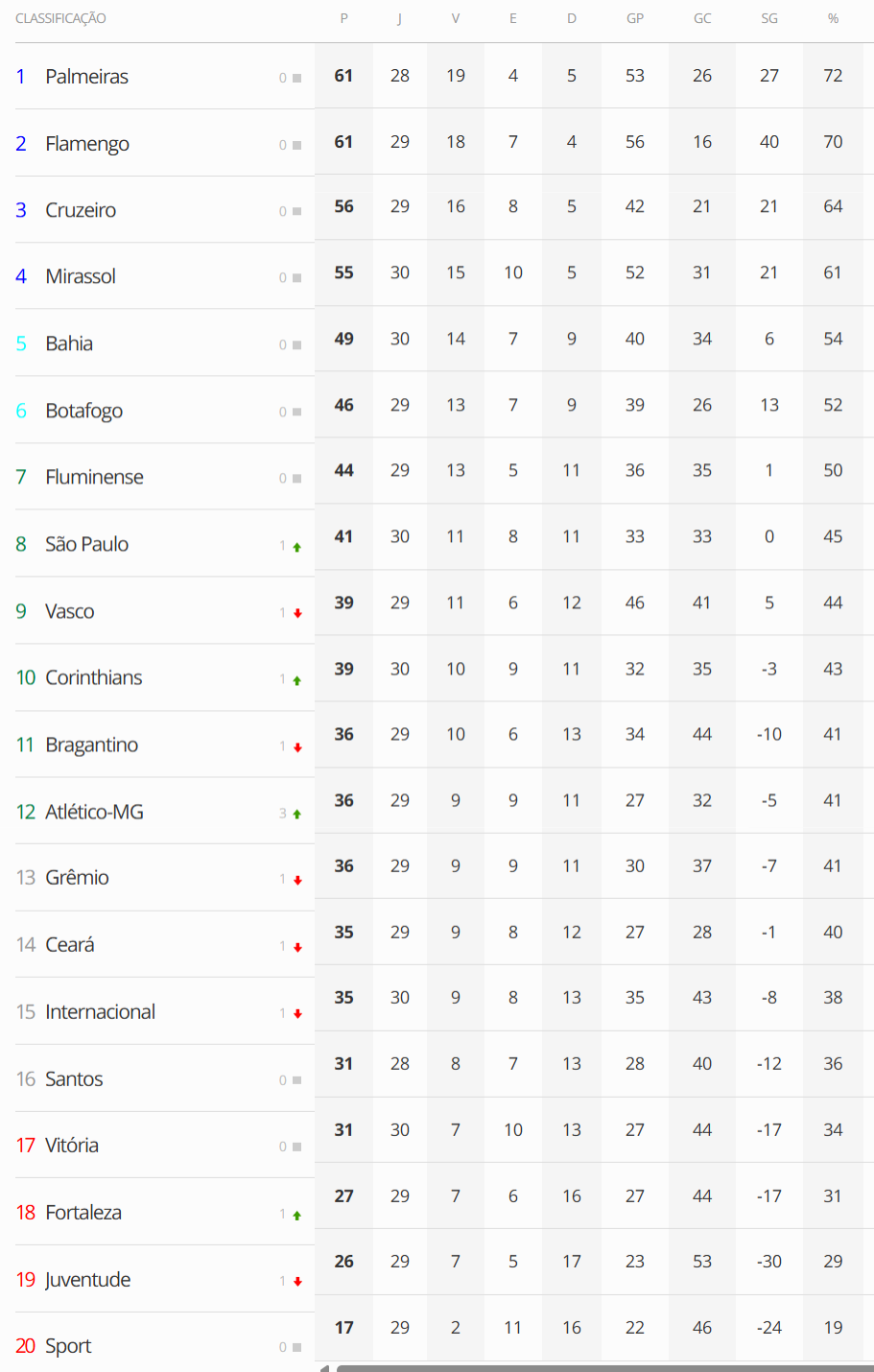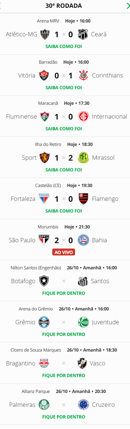 Seis jogos abriram a 30ª rodada do Campeonato Brasileiro neste sábado. O Vasco, que enfrenta o Red Bull Bragantino neste domingo em São Paulo, está em 9º lugar.