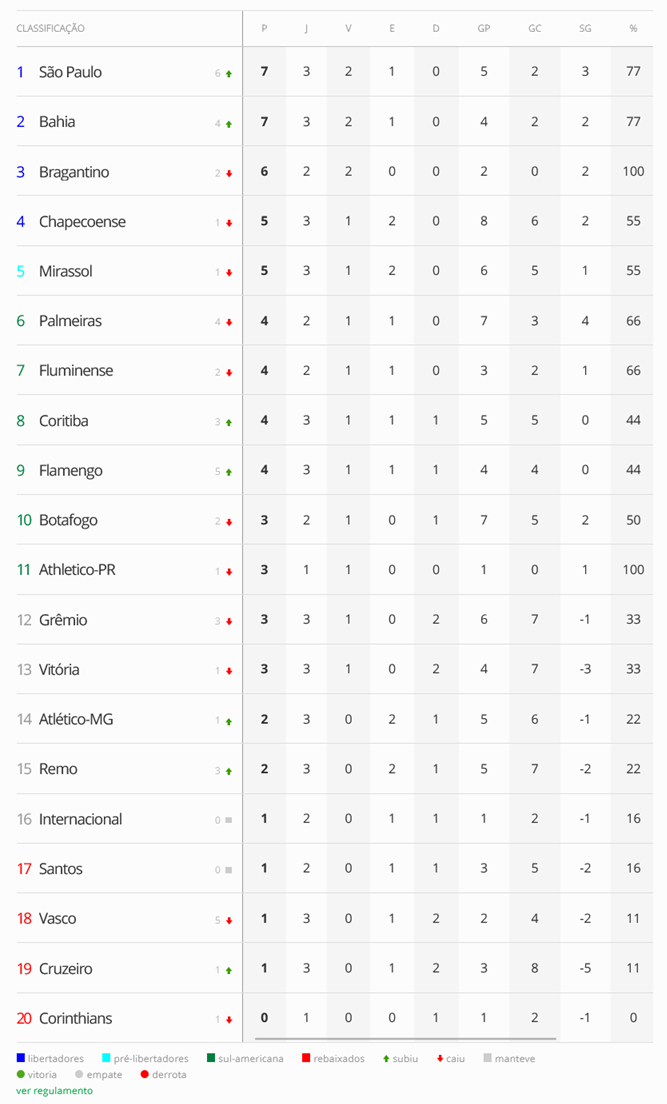 Com os resultados de 4ª-feira da 3ª rodada do Campeonato Brasileiro, o Vasco, que perdeu para o Bahia por 1 a 0, caiu para 18ª posição e agora está na zona do rebaixamento, o Z4.