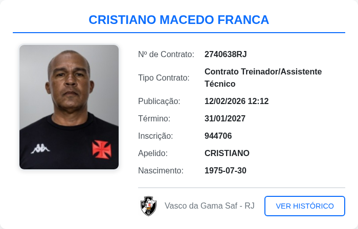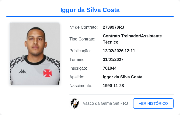 Tipo de contrato: Contrato Treinador/Assistente Técnico