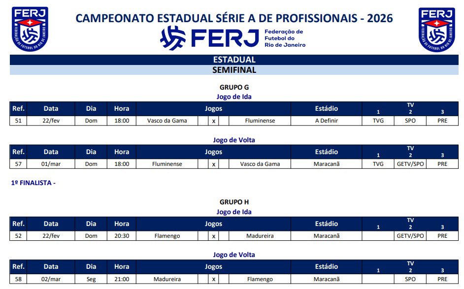 A FERJ divulgou nesta terça-feira (17) os horários e dias dos jogos das semifinais entre Vasco e Fluminense e Flamengo e Madureira. Entretanto há um grande problema: a federação carioca marcou os dois primeiros jogos da semifinal para o domingo, dia 22 de fevereiro. O clássico para as 18h (de Brasília), com local "a definir", e o duelo entre o Rubro-Negro e Tricolor Suburbano às 20h30, no Maracanã.