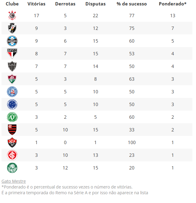 Devido à grande diferença no número de disputas ao longo dos anos e do número de temporadas em que cada clube esteve na Série A, o percentual de sucessos foi multiplicado pelo número de vitórias para organizar as equipes em um ranking. É fácil compreender o motivo: qual equipe é mais eficaz nessas disputas, o Corinthians com aproveitamento de 77% em 22 desempates ou o Vitória, com 100% em uma única participação em disputas por pênaltis? Consideramos que é o Corinthians.