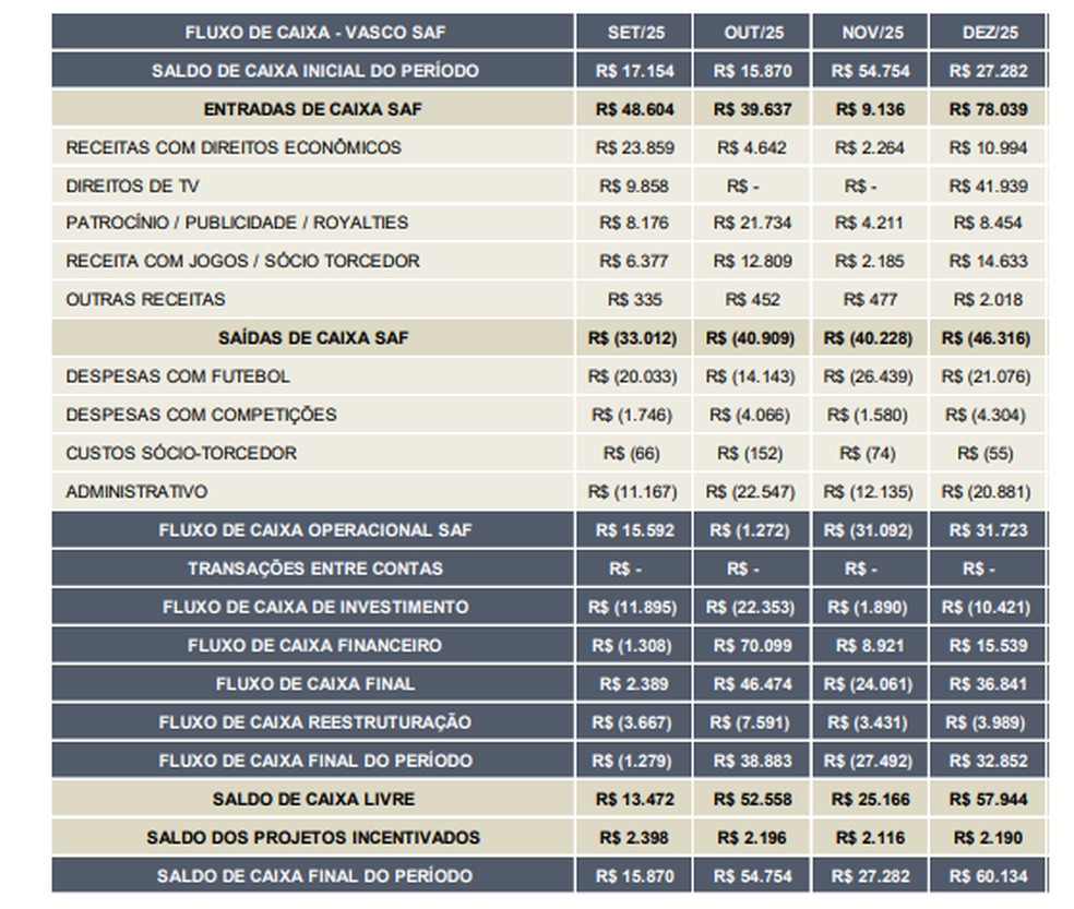 O Vasco terminou o ano de 2025 com R$ 60 milhões em caixa. Veja os números apresentados abaixo.