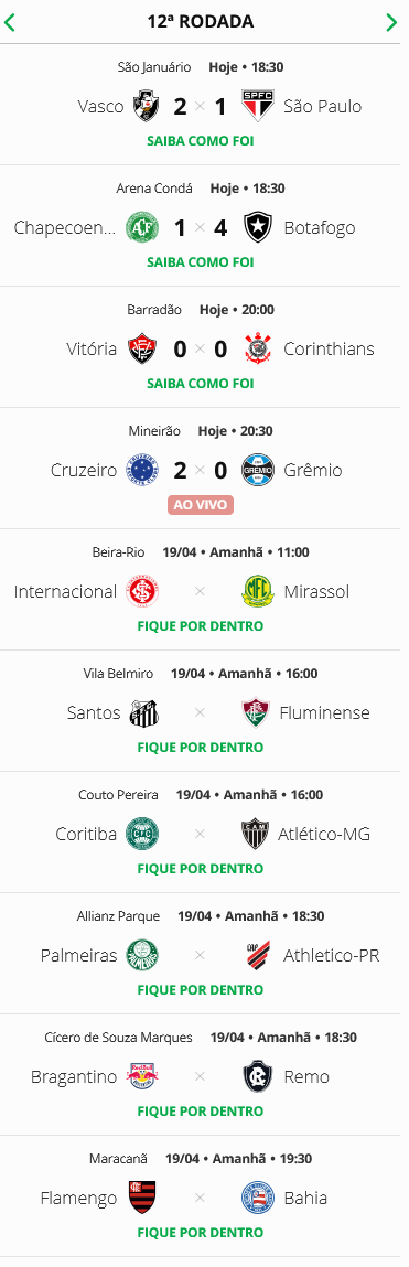 Quatro jogos abriram a 12ª rodada do Campeonato Brasileiro neste sábado. O Vasco, que venceu o São Paulo de virada por 2 a 1, está em 9º lugar. Outros seis jogos serão disputados neste domingo.