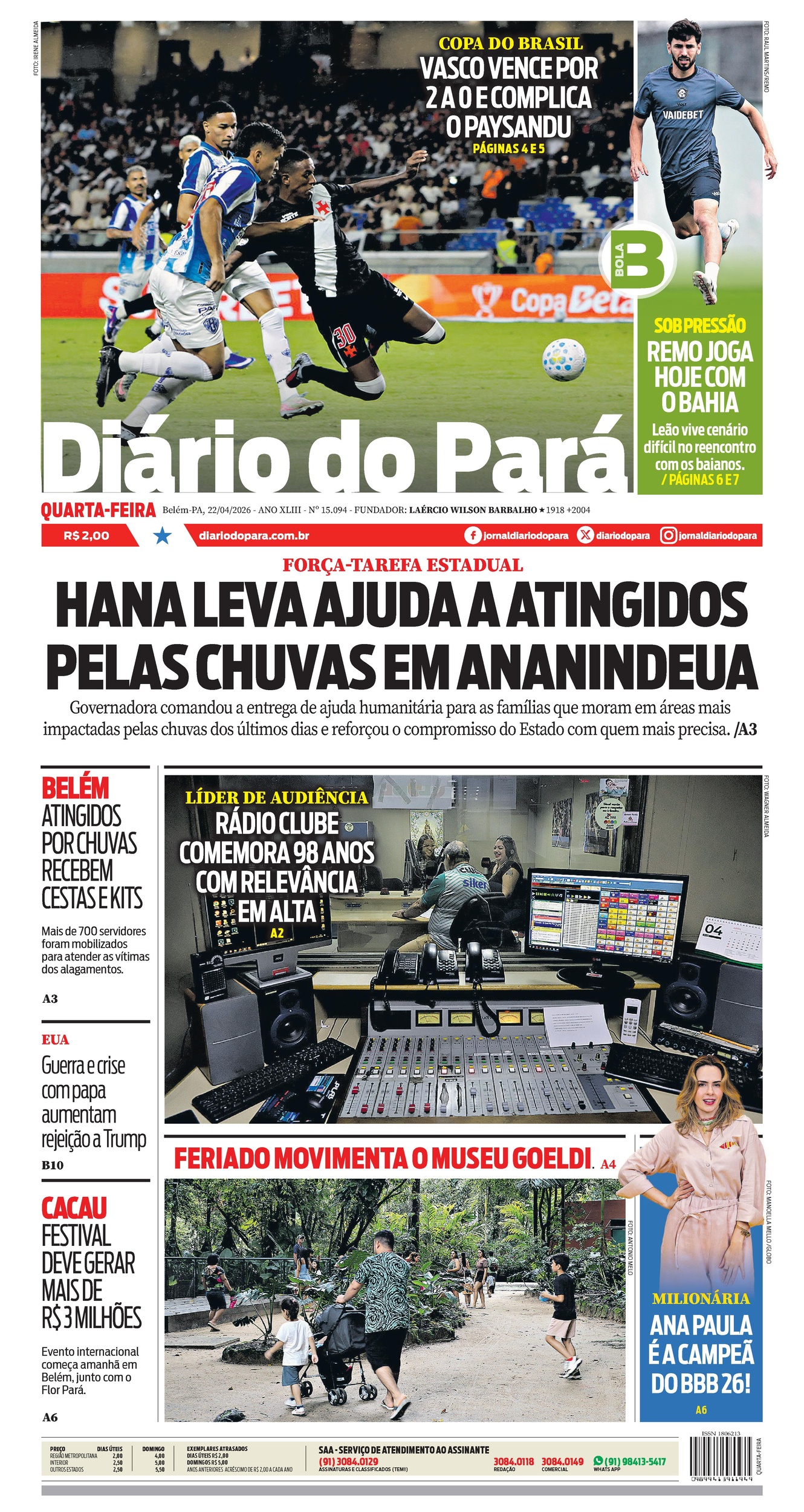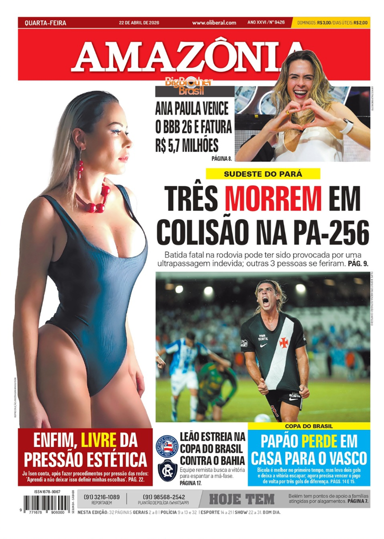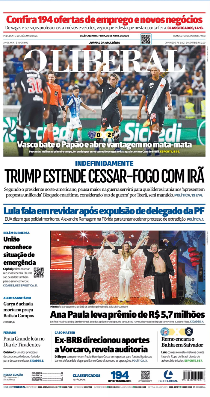Veja as capas dos jornais após Paysandu 0 x 2 Vasco
