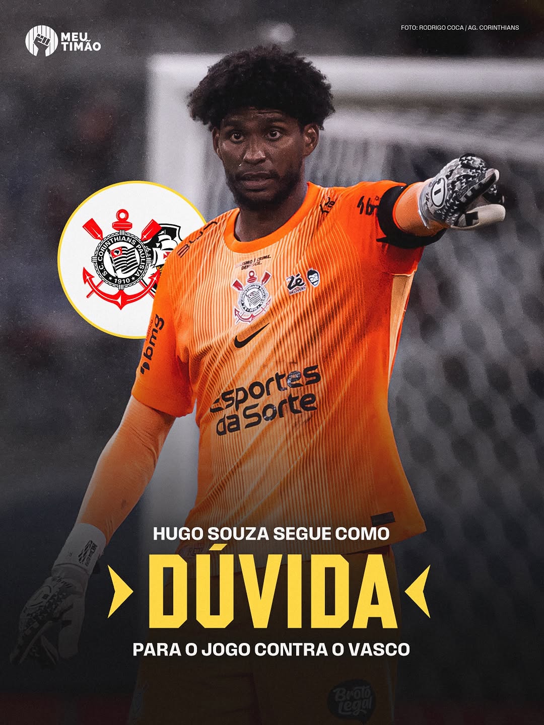 O Corinthians recebe o Vasco da Gama neste domingo, às 16h, pela 13ª rodada do Brasileirão, e pode ter um desfalque importante. O goleiro Hugo Souza é dúvida para o confronto por conta de dores musculares na coxa, sentidas na partida contra o Vitória. A informação é do Meu Timão.