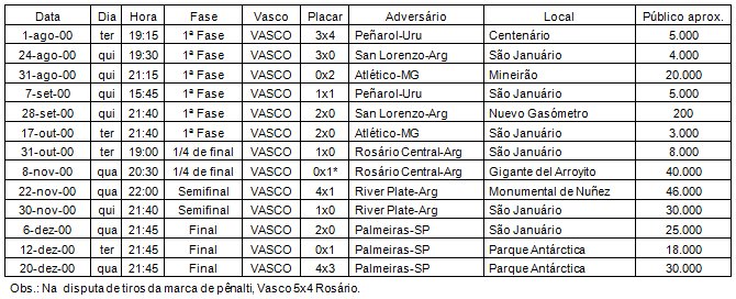 Foi um jogo estranhamente único, sob todos os aspectos. A vantagem obtida pelo Verdão na fase inicial foi construída somente depois dos 37 minutos. Tudo foi muito rápido. O panorama apontava apenas um ligeiro domínio por parte dos paulistas. Mas quando Arce converteu a penalidade máxima bobamente cometida por Júnior Baiano e, em seguida, 43 segundos após a abertura do placar, Magrão aumentou, a casa vascaína pareceu ter ruído de vez. O tento de Tuta foi o balde de água gelada que sugeriria a queda certa do Gigante em mais uma final no ano 2000, aquela seria a quarta derrota em decisões na temporada. As pretensões cruzmaltinas de encerrar o ano de modo diferente de como havia sido o seu começo estava caindo por terra.