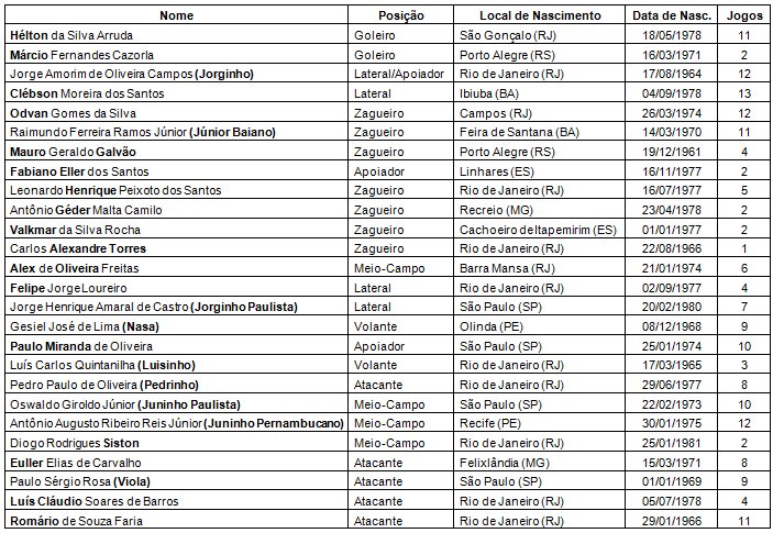 Vasco: Hélton, Clébson, Odvan, Júnior Baiano e Jorginho Paulista; Nasa (Viola, no intervalo), Jorginho (Paulo Miranda aos 31/2T), Juninho e Juninho Paulista; Euller (Mauro Galvão 42/2T) e Romário.