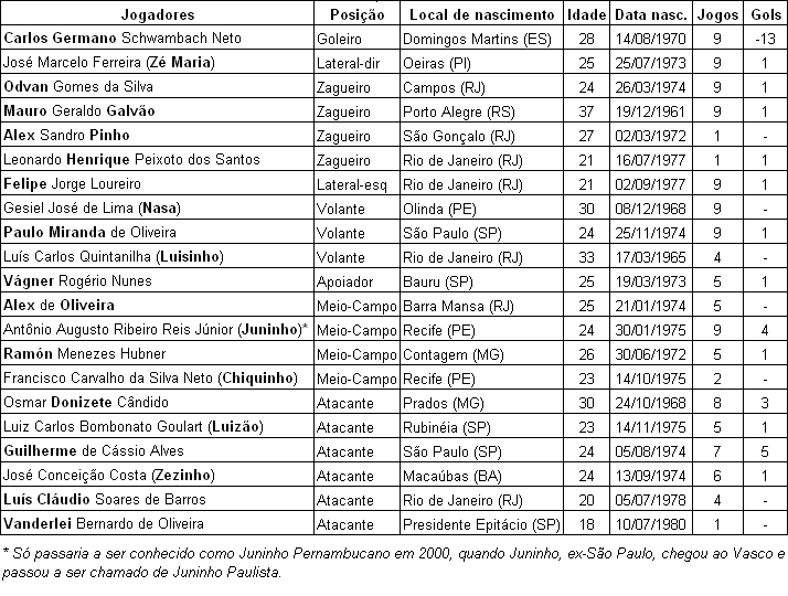 Vasco: Carlos Germano, Zé Maria, Odvan, Mauro Galvão, Felipe; Nasa, Paulo Miranda, Juninho Pernambucano (Henrique 42/2T), Ramón; Donizete (Vágner 14/2T) e Luizão (Zezinho 37/2T). Técnico: Antônio Lopes
